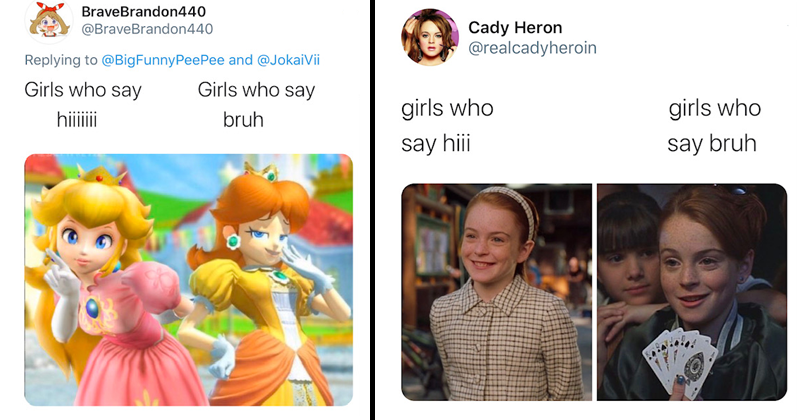 Long live the troll. And that goes. Twitter memes the difference between girls who say hiii and girls who say bruh funny memes that get it and want you to too. The format is a split screen dialogue between fictional frenemies serena van der woodsen blake lively and blair waldorf leighton meester. Girl please guys think about so many other stuff you be shocked. From threads of funny stories to vines gifs and memes you will always find something that makes you say this is literally my life black twitter is the heart of twitter itself. Gossip girl nostalgia is alive and well on twitter where the show has inspired a new meme format.