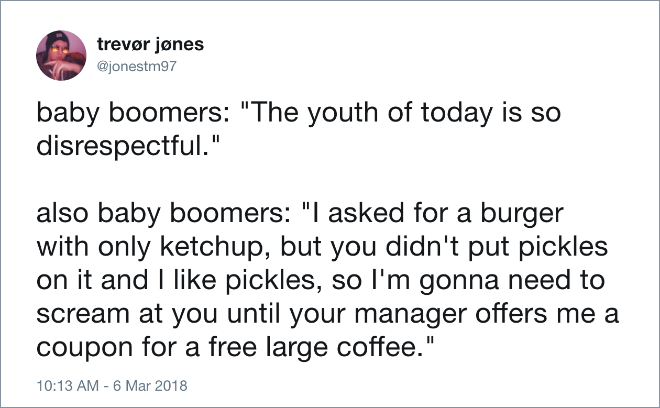 Gen x vs boomer meme. Gen x was born between 1965 1979 and are currently between 41 55 years old 82 million people in u s gen y. Gen z and millennials may have dark and strange humor that flusters the older generations and the gen x and baby boomers. Gen z has taken to calling gen x once a mere bystander in the generational wars the karen generation as in karen the middle aged white mom who is always asking for the manager and wondering why kids are so obsessed with their identities. It s a hilarious poke at how letters were used to identify the demographics a practice that started with gen x. Gen y or millennials were born between 1980 and 1994. We might not have jobs but at least we have a good sense of humor. This comes as a divide between society s standards both of young and of old.