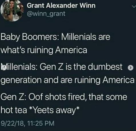 Maybe millennials shouldn t have invented cyber bullying if they didn t want gen z to perfect it anya volz anyavolz june 14 2020 all they do is drink wine post cringy 90s kid meme talk about tech start up and lie said one tiktoker not pulling any punches. The viral tweet with almost half a million likes was introduced by b w. Carlin an ex sports illustrated employee who now works at the xfl according to his twitter bio. Now gen z is training their memes on millennials.