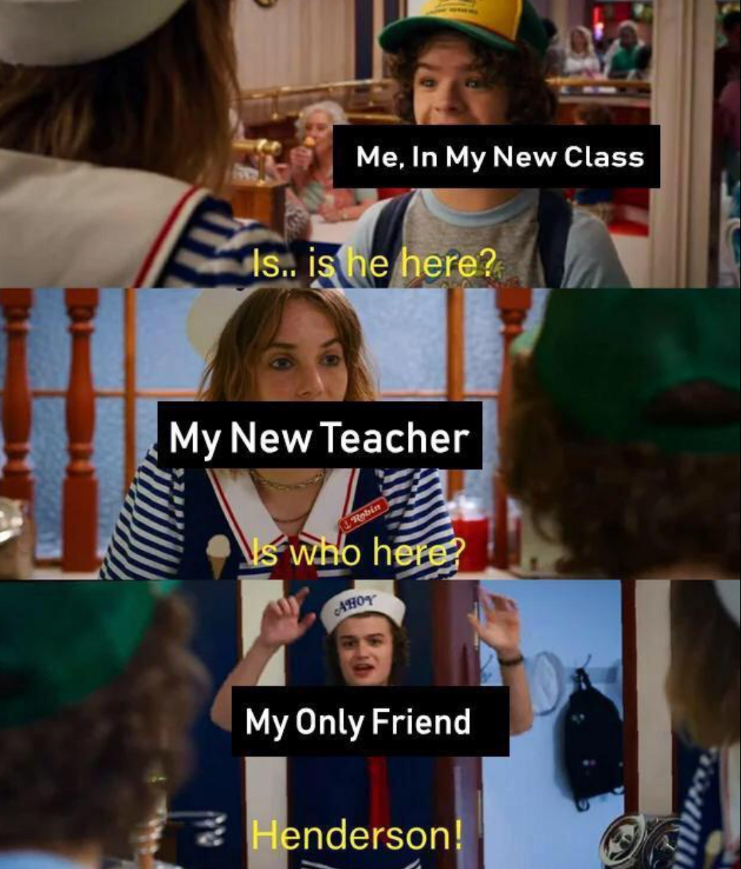 Stranger things scoops ahoy meme. Literally what s going on right now on this subreddit. Robin steve s scoops ahoy sailor outfits from stranger things season 3 will make the best halloween costume. Caption a meme or image make a gif make a chart make a demotivational flip through images. Easily add text to images or memes. On july 4th 2019 netflix released season three of. So if you re anything like the rest of the internet then here s a load of tweets memes and appreciation posts about the four american heroes who helped saved hawkins from the evil russians. Classic and rare vines to watch when you lose your will to live duration.